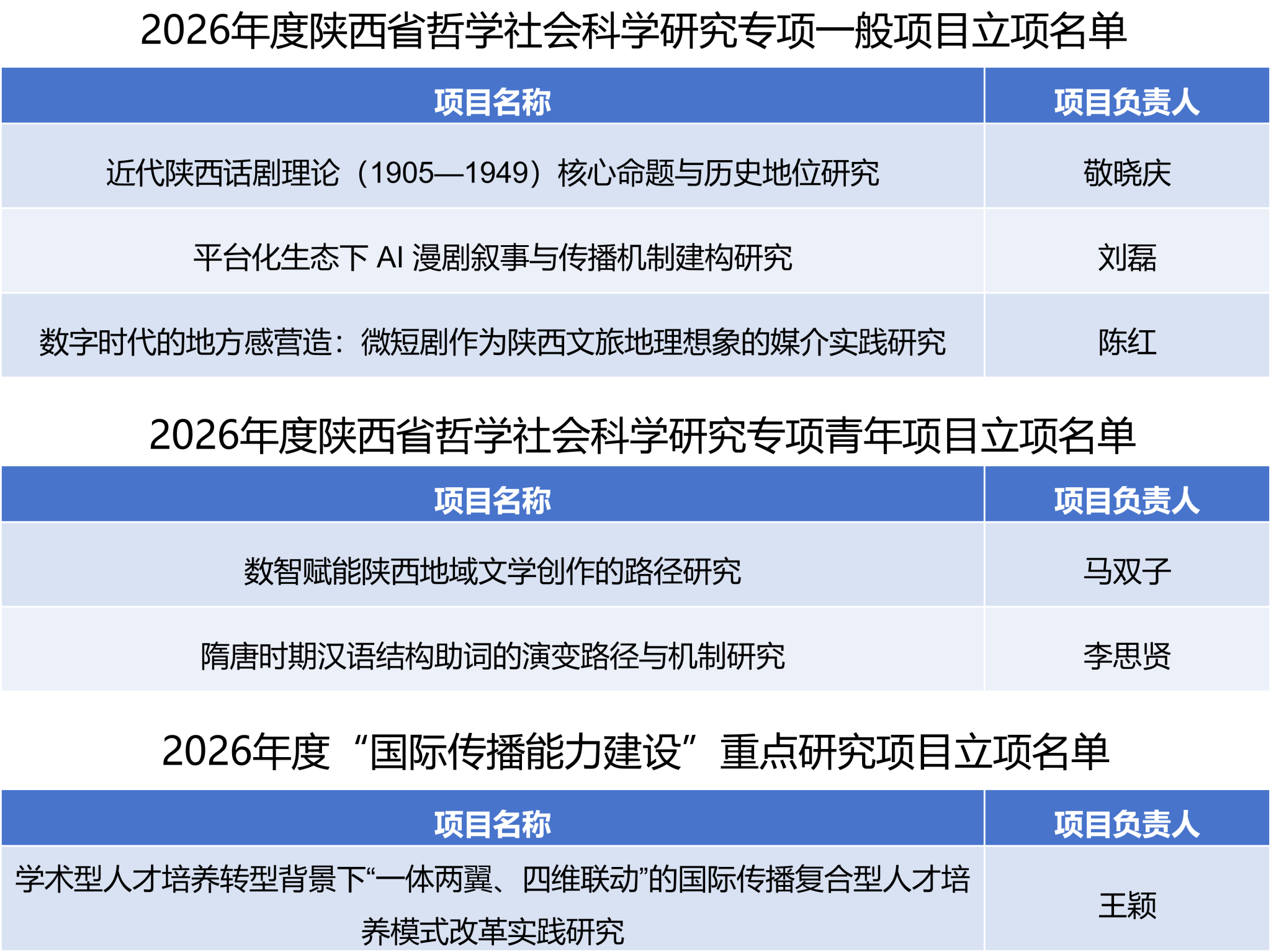 日前,陕西省社会科学界联合会先后公布了2026年度陕西省哲学社会科学研究专项立项名单及2026年度“国际传播能力建设”重点研究项目立项名单,竞彩
