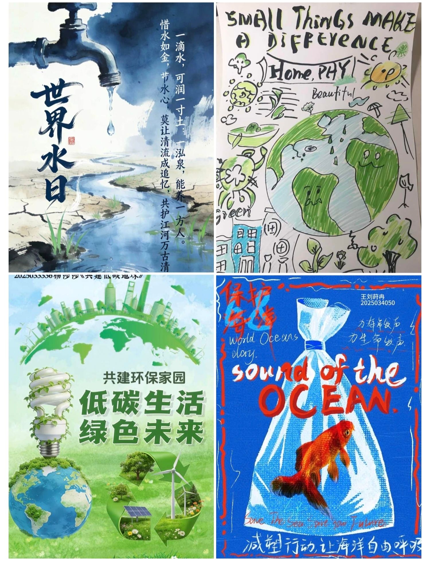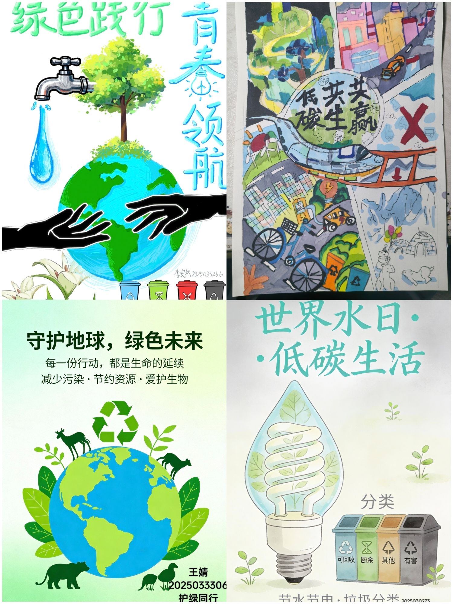 本次活动面向全院同学发起线上作品征集,围绕“环保节约、绿色行动”主题,征集海报、绘画、手抄报等视觉作品。自活动启动以来,同学们踊跃参与,将对生态的守护、对低碳生活的向往融入创作:有的绘就蓝天碧水的自然盛景,有的设计垃圾分类创意海报,有的搭配文字宣传节约理念,一幅幅作品尽显文院青年的环保担当与青春风采。同学们在交流欣赏中碰撞创意、凝聚共识,让“绿水青山就是金山银山”的理念深入人心,也让志愿精神在数字空间焕发新活力。